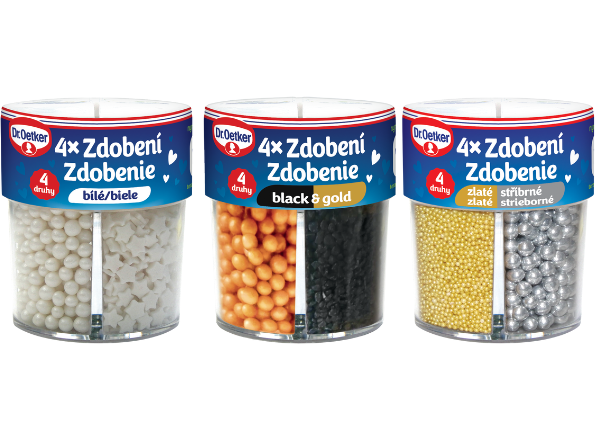te, aby vaše cukroví opravdu zazářilo, sáhněte po Zdobení 4 druhy black & gold Dr. Oetker. Kombinace zlatých a černých perliček, drobných kamínků a kuliček dodá každému kousku elegantní a slavnostní vzhled. Můžete si podle vlastní chuti a fantazie ozdobit linecké cukroví, perníčky i moderní cup cakes, a jednoduše tak vytvořit originální dezerty.
