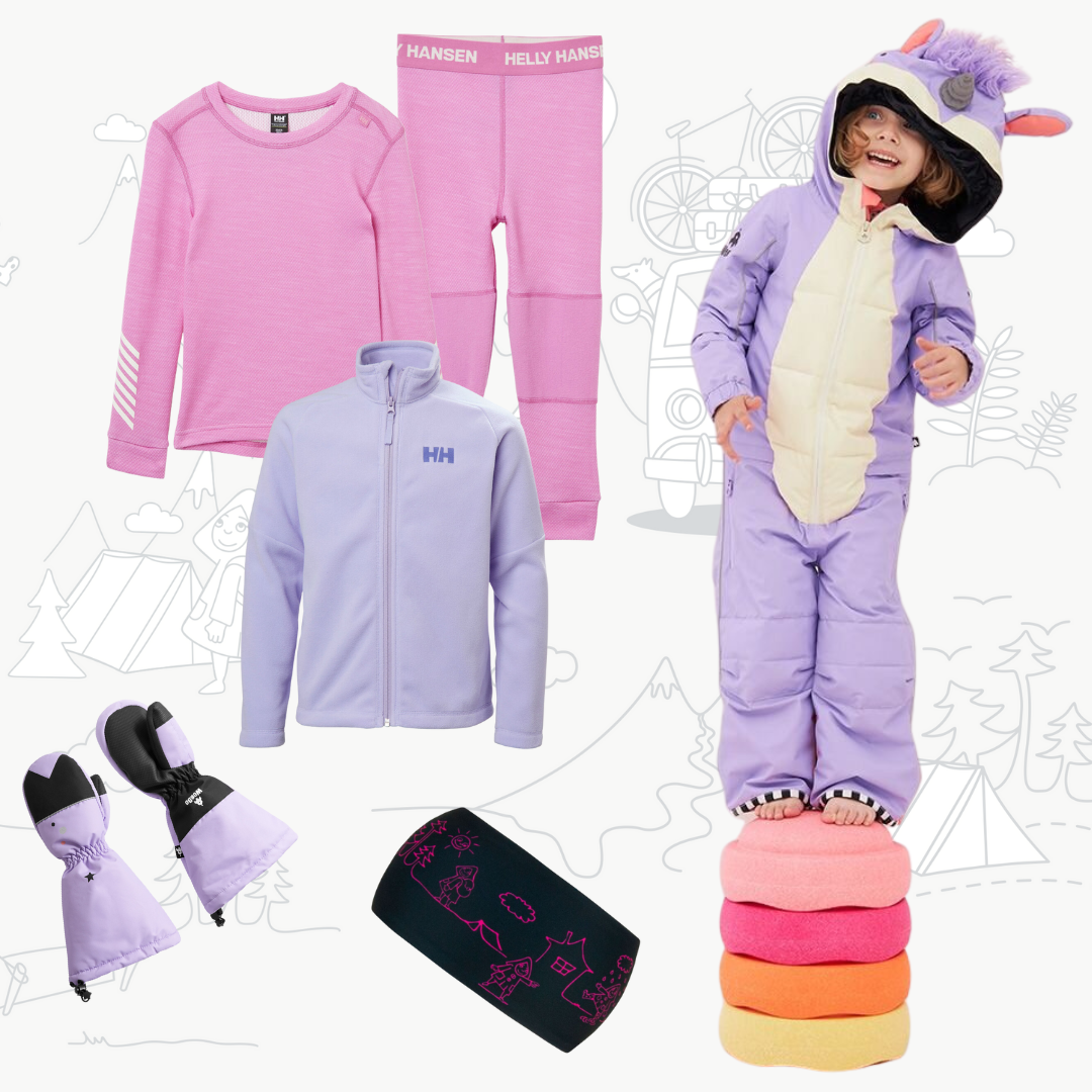 Děstké termoprádlo Helly Hansen K Lifa Merino set, 1689 Kč; dětská fleecová mikina Helly Hansen, 1289 Kč; dětské zimní rukavice WeeDo Unido Lila, 1249 Kč; funkční dvouvrstvá čelenka Promaledobrodruhy s fleecem, 399 Kč.