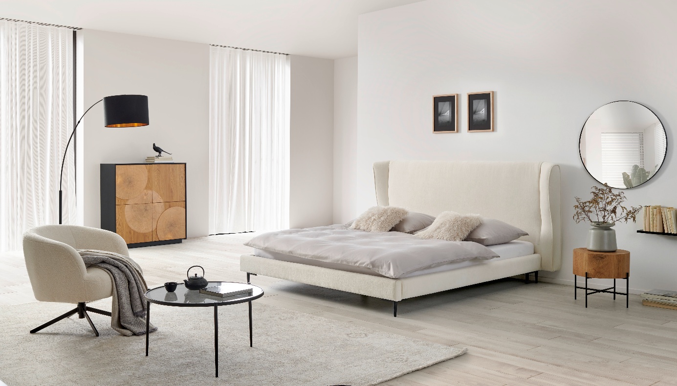Pro rok 2026 má XXXLutz v nabídce také několik produktových novinek, které trend reflektují – od čalouněných postelí a sedaček v krémových tónech až po elegantní nástěnné police, svítidla a keramiku inspirovanou „obláčkovou“ bílou.