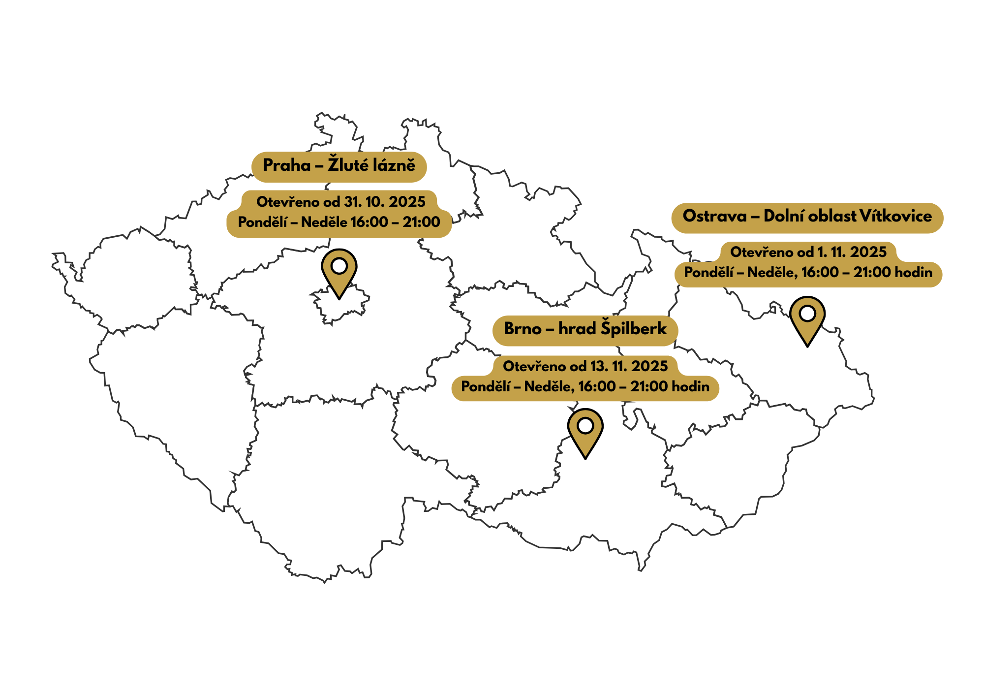 Vedle nové pražské expozice mohou návštěvníci zažít také další světelné výstavy v České republice – například na brněnském Špilberku, který je dominantou města, nebo v jedinečném industriálním areálu Dolní Vítkovice v Ostravě. Každá výstava je originální a všechny spojuje snaha přinášet krásu, radost a inspiraci.Více informací na: storyoflights.eu
