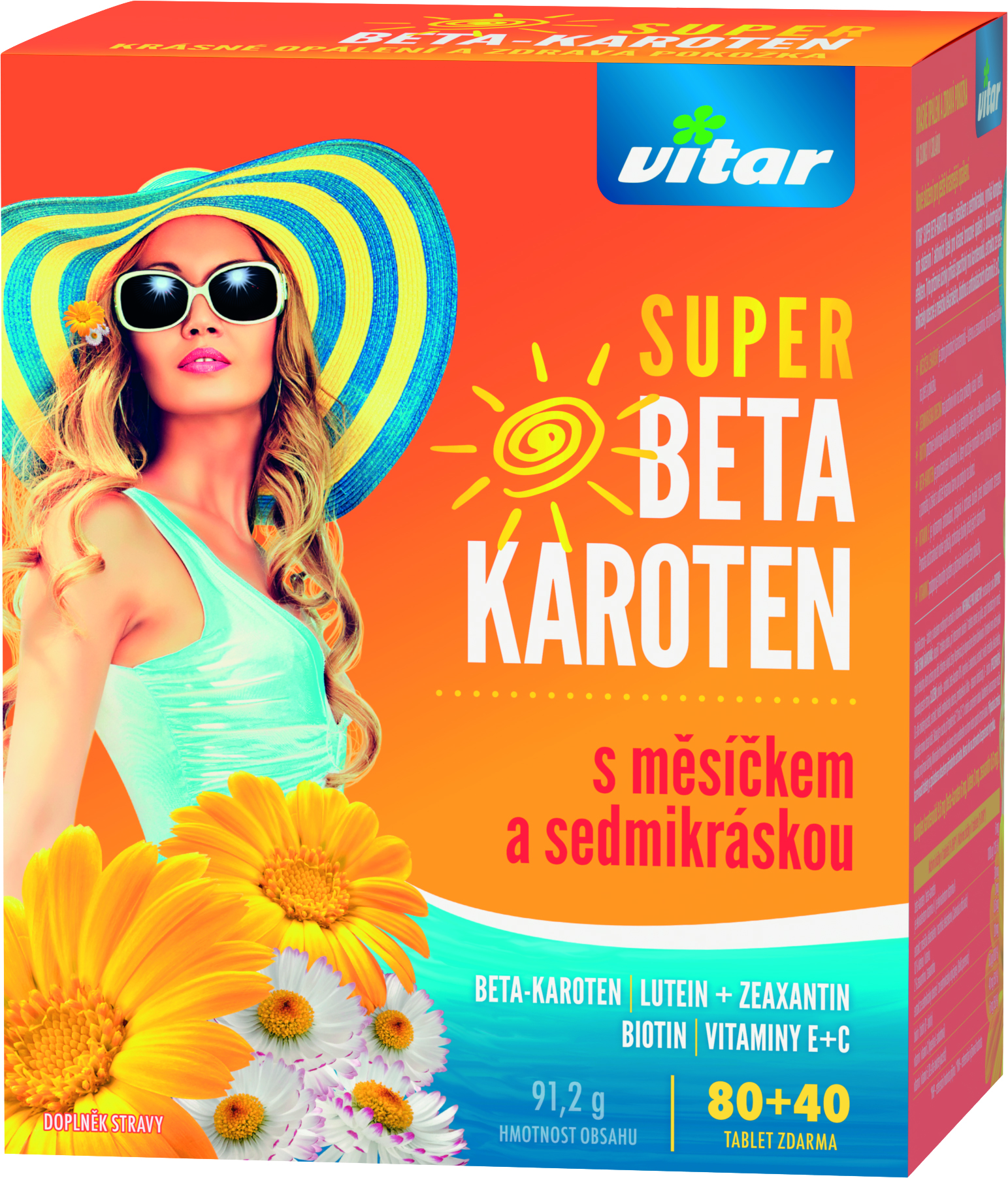 Vitar Super beta-karoten s měsíčkem a sedmikráskou vyniká komplexním složením 7 aktivních látek pro krásné bronzové opálení s dlouhotrvajícím efektem. Tyto příznivé účinky přináší specifický mix karotenoidů, extraktu ze sedmikrásky obecné a měsíčku lékařského, biotinu a antioxidačních vitaminů E a C.